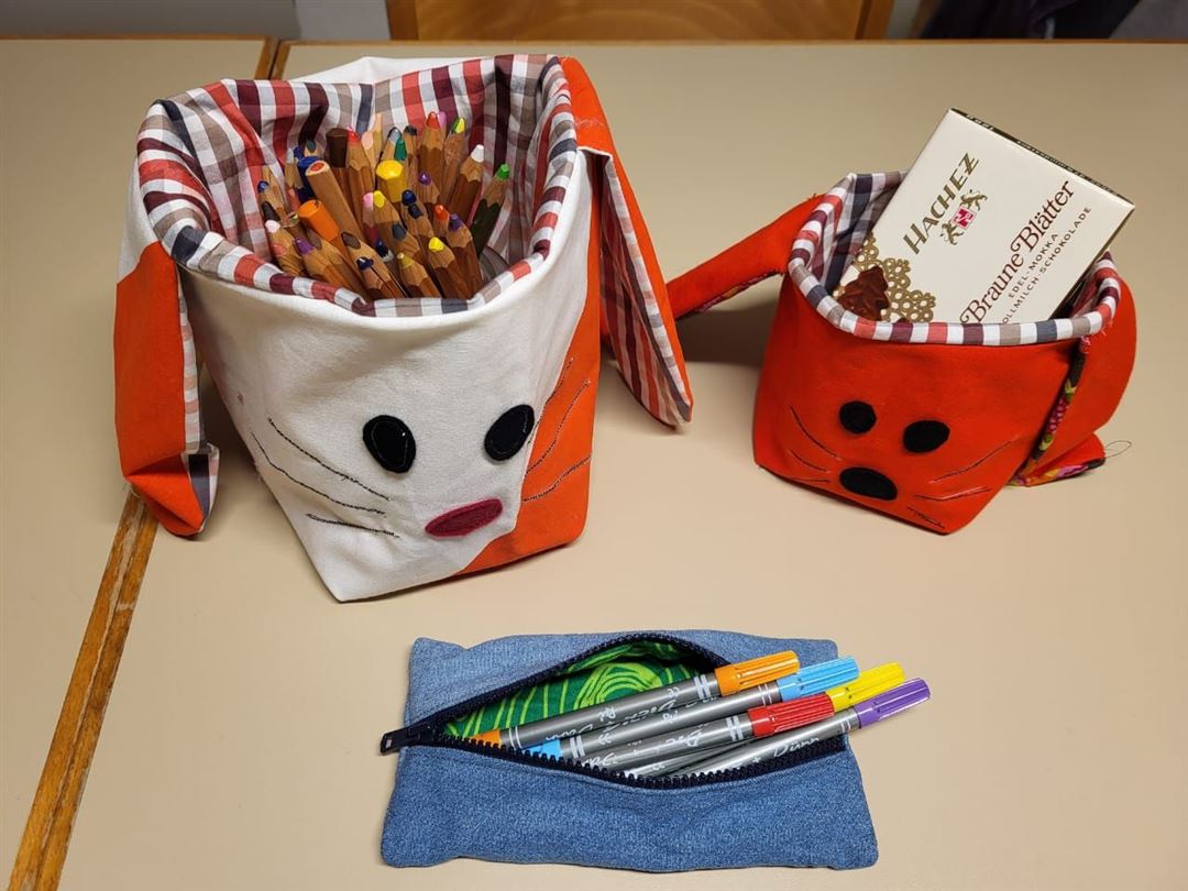 Wir sind eine fröhliche Runde, die ca. einmal im Monat freitagabends gemeinsam jahreszeitliche Deko, nützliche Küchenutensilien, kleine Täschchen und Mäppchen und vieles mehr näht.