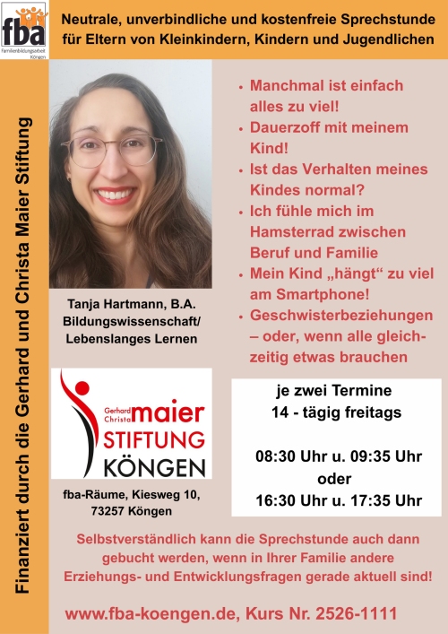 In Einzelfällen sind auch Abendtermine ab 19:30 Uhr in Absprache mit Frau Hartmann möglich; bitte nehmen Sie hierfür mit uns per Mail anmeldung@fba-koengen.de oder telefonisch 07024-868789 Kontakt auf.