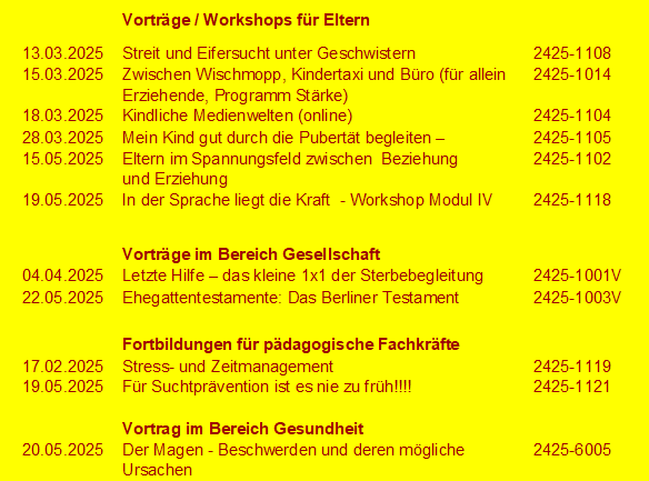 Vorträge / Workshops bis zu den Sommerferien